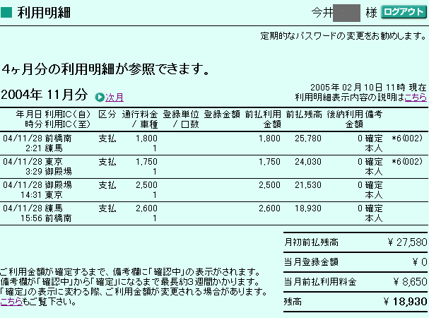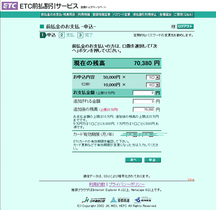 | 丁度、同じ区間を乗っているので比較でわかり易いと思いますが、往路(3,550円)復路(5,100円)で、夜間割引を使うとなんと1,550円(約3割引)も変わります!夜間の移動が多い釣り人にとっては使わない手はありません。 ・導入費用と購入のポイント @車載器を購入し、取り付ける AETCカードを取得 Bインターネットから前払い利用料を払う。 まずETCサービスを利用するにはETC車載キットを買わないとなりませんが、これはお近くのカーショップにいけば売っています。車載キットは「カード一体型」と「受信機、カード本体分離型」があります。値段は後者の方が高いですが、「一体型」だと見えやすいところにカードを晒すことになりますので、防犯上あまりオススメではありません。出来れば「分離型のほうが」いいでしょう。 およそ、費用的には車載キット+工賃込みで2万円〜3万円程度(05年01月)が相場です。 ちょっと高い気もしますが割引ですぐに元は取れますし、継続して割引が利くのですからここは思いきってつけてしまいましょう。 次にETC用のICチップが埋め込んであるETCカードを手配することになります。カーショップでススメられる事も多いですが、もし既にクレジットカードをお持ちでしたら、既に契約しているカードだと与信の手間がないので取得期間が多少、短縮できます。ETCカード契約書を送ってもらい、記入の上で返信すれば1週間〜10日でETCカードが送られてきます。 一応ここまでで、ETCサービスは利用できますが、下の前払いサービスを利用するとさらにお得になります。 前払いサービスはETC版のハイウェイカードです。ハイウェイカードと同様、1万円で500円のプレミアがつき、5万円では8000円ものプレミアが付きます。 インターネットで「ETC前払いサービス」のページにアクセスし「サービス紹介・登録申し込みへ」から「新規ユーザー登録」に入り会員手続きをとる(事前に車のナンバーと、車載器の登録番号※購入時の保証書に記入してあります。…を把握しておくと良い)。すると前払い会員のIDパスワードがもらえます。 今度は「会員用トップページ」から入り、「前払い金のお支払・残高照会へ」を押してログインページに進みます。そこで先ほど手に入れたID・パスワードを使って中に入ると
