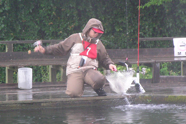 5月中旬にしては肌寒い気温。朝から雨が降ったり止んだりのあいにくの天気。直前放流した魚もレンジが定まらず、時間内で探るにはやや難しい感じ。決勝開始直後からは本格的に雨が降り出したが釣果には影響はなかったようで、一尾を争う白熱した戦いになった。