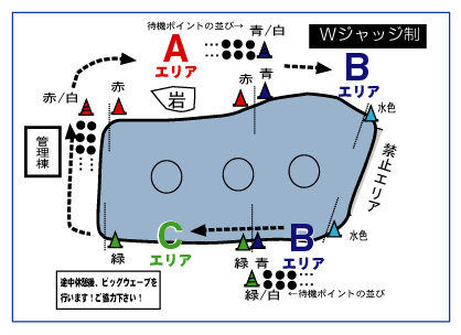 予選→決勝方式 ・受付時にひいたくじの順番で(A〜Cエリアx前半・後半)※6グループのスタートエリアを決める。(くじの順番にっては希望のエリアに入れない場合もある) ・A前〜C後 各グループの中からのそれぞれ勝ち上がり。(勝ち上がり目安、上位40%)