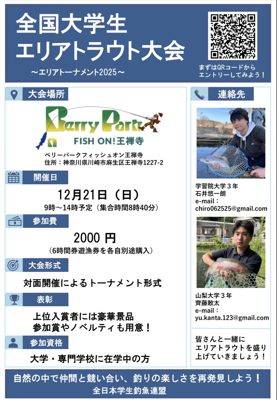 12/21(日)に、ベリーパークフィッシュオン!王禅寺にて大学生のためのエリアトラウト釣り大会が開催されます。