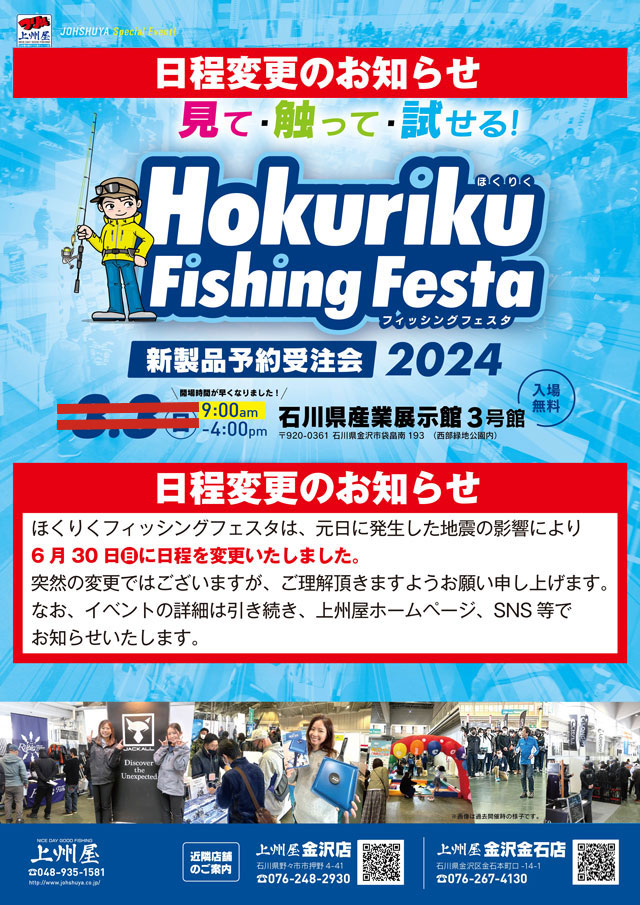 【日程変更のお知らせ】ほくりくフィッシングフェスタ2024新製品予約受注会! - つり具の上州屋