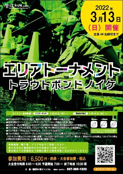 エリアトーナメント2022第5戦トラウトポンドNOIKE・春大会を3月13日(日)に開催いたします。インターネットエントリーは2月22日(火)0:00より開始します。