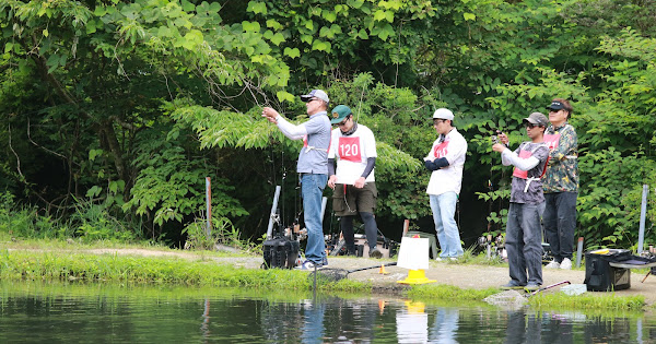 朝の気温21℃、水温16℃。天候は曇り。湿度が高く梅雨時らしいローライトの1日。池色は金曜の大雨の影響でやや土砂濁りが残る。2号池は落ち葉等の浮遊物があり表層を引きずらいコンディションの中、大会は始まる。予選は5人1組総当たりで行われた。