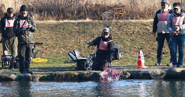 決勝トーナメントは予選勝点上位者16人が進出。準々決勝、準決勝は1vs1で10分x前後半で行われた。大会区画の放流はなかったものの、一般利用者向け放流も混じって手前ブレイクはあきらかに回遊が増えている状況に。予選以上にスコアは伸びた。決勝は15分x2ローテで行われた。この時間になると気温16℃、水温10℃まで上昇。風が0~3mと少し風が出て来て、上空をかたまった雲が通過する状況へと変化していた。