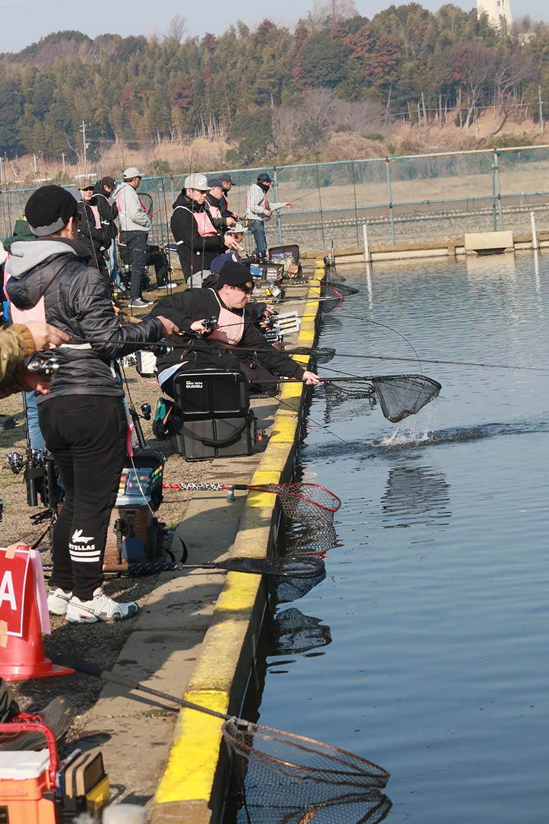 予選7回戦開始前に釣座ローテーションと放流が入る。この頃には気温15℃、水温も10℃台に上昇。この時間も[A][B][F][K][L]の四隅寄りの釣り座は反応良く釣果が伸びました。その後はスロー展開に落ちると、各試合とも0~3本程度のスコアが続きました。