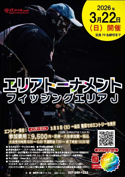 エリアトーナメント2026第6戦フィッシングエリアJ大会を3月22日(日)に開催します。インターネットエントリーを3月3日(火)20:00より受付開始します。