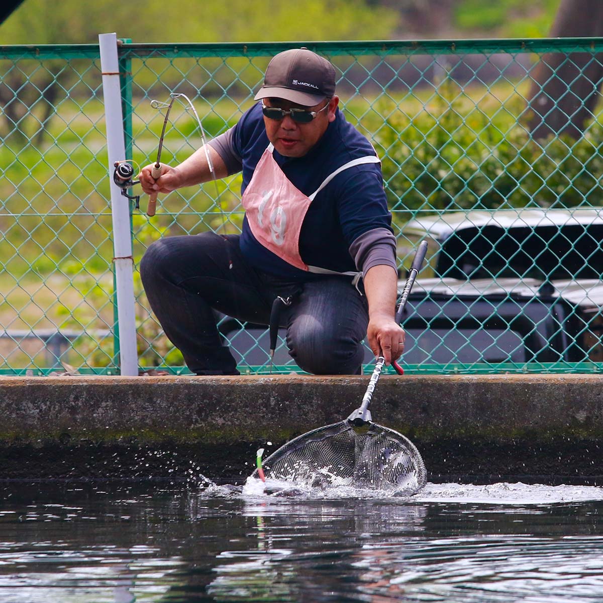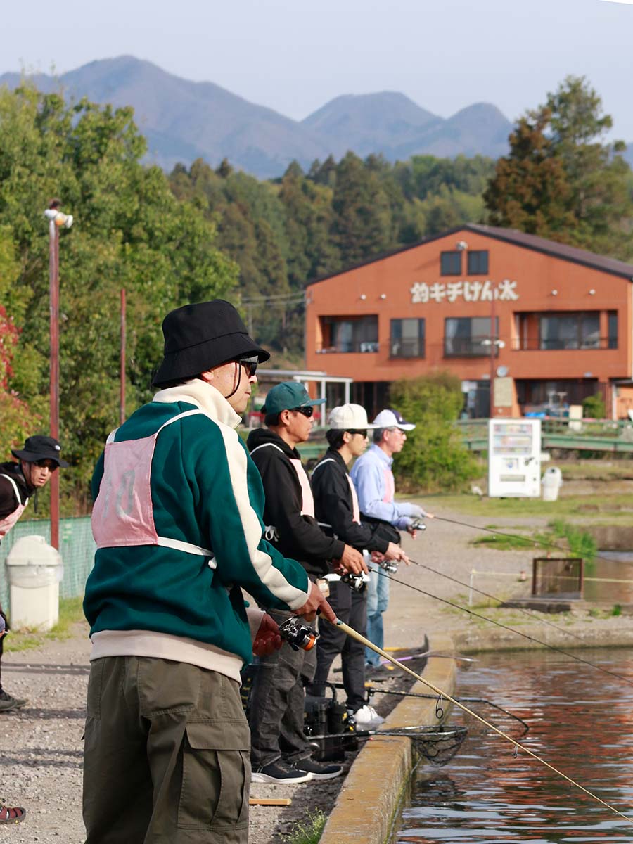 予選1回戦は放流回。今年はこの時期にしては低水温。まずまずのコンディションでスタートしました。開始直後は東側の崖上に太陽が掛かるローライト。当日放流の魚の反応は良く、開始直後から放直色スプーンで手返しを競う時間になりました。比較的、日が当たりだした川側[B]エリアの釣果が伸びる一方で、日陰の山側[A]エリアのスコアは伸び悩む。予選2回戦になると活性は少し落ちるが、日が当たるBエリア側は魚が動き良いアタリがでる。レギュラーサイズは30cm前後で時より40~50cmのドナルドソンも混じるといったサイズ感。予選3回戦頃になると薄い雲も取れて気温、水温共に上昇。池全体に日が当たると表層から中層寄りにレンジが落ちていった印象を受けました。