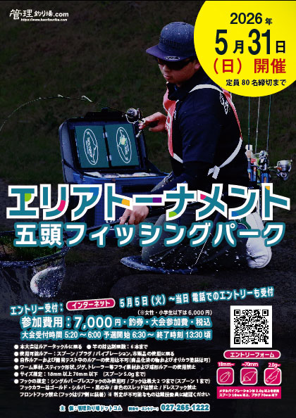 エリアトーナメント2026第13戦GOZU FISHING PARK大会を5/31(日)に開催いたします。インターネットエントリーを5月5日(火)20:00より受付開始します。
