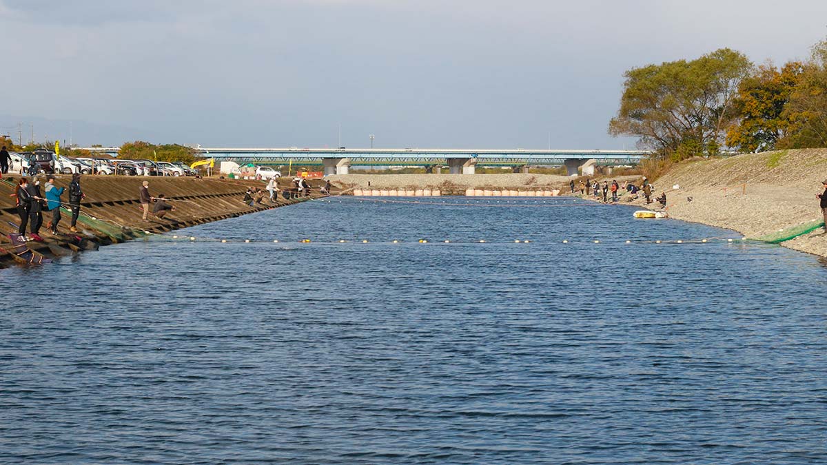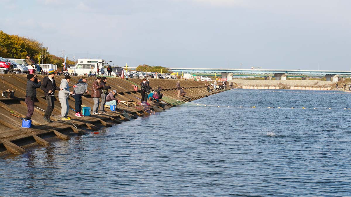愛知県一宮市。木曽川を使った『北方マス釣り場』(市民憩いの場マス釣り体験場)は冬の風物詩。持ち帰り制限なし。木曽川漁協管理。