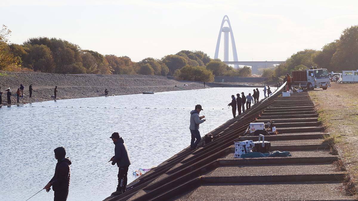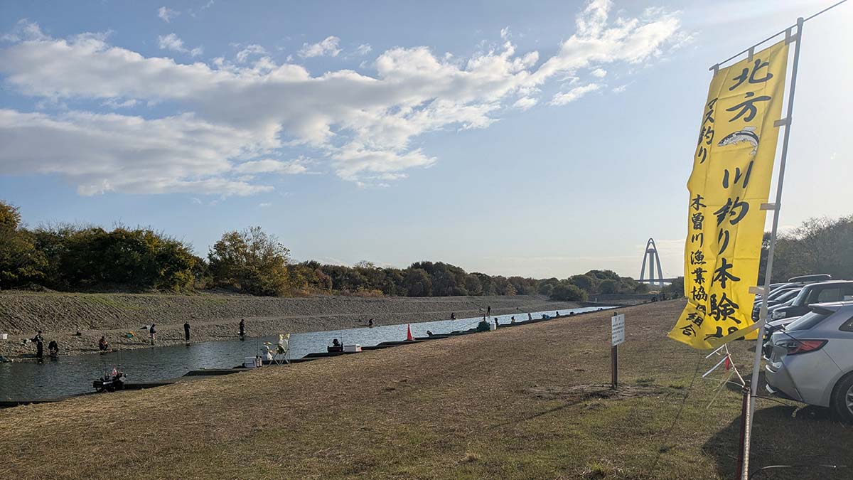 北方川釣り体験場(北方マス釣り場)は愛知県一宮市と岐阜県各務原市の県境にある木曽川で毎年11月頃~翌年4月頃まで開催されます。周囲は河川敷きの雑木林や冬枯れの草木など。上流側は木曽三川の雄大な流れを表現する138タワーパーク。下流側は国道22号バイパス橋、東海道本線の鉄道橋なども見え広々とした空の下で釣りを楽しめます。