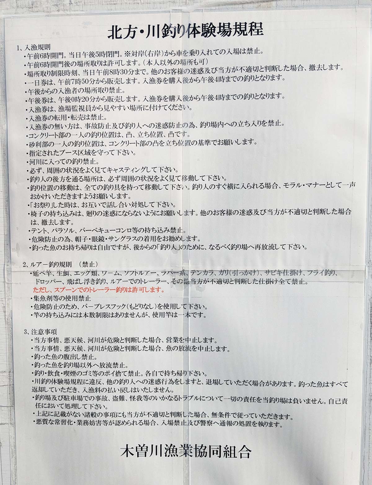 ●北方マス釣り場は木曽川本川の水位の影響を受けます。概ね護岸側のコンクリート枠の2段目の少し下程度の水位が標準ですが、木曽川本川の渇水・増水などで上下します。C&R釣行の人はランディングネットは柄が長い物、または長さ調整できるものが良いでしょう。また魚を貯めておくフラシも筒状の長めの物が好まれています。