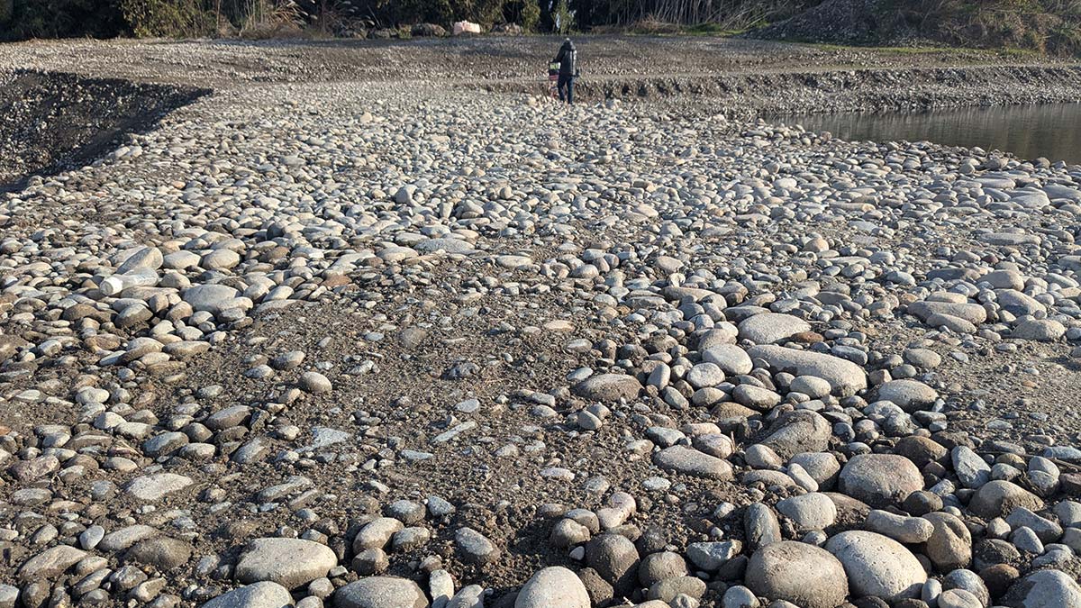 対岸側の足元は中流域でよく見かける大小の丸石が転がっています。こちらは平底のスニーカーやサンダルなどでも歩けなくはないですが、一般的なアウトドア系のグリップ力の高い靴やスニーカーなどが無難でしょう。