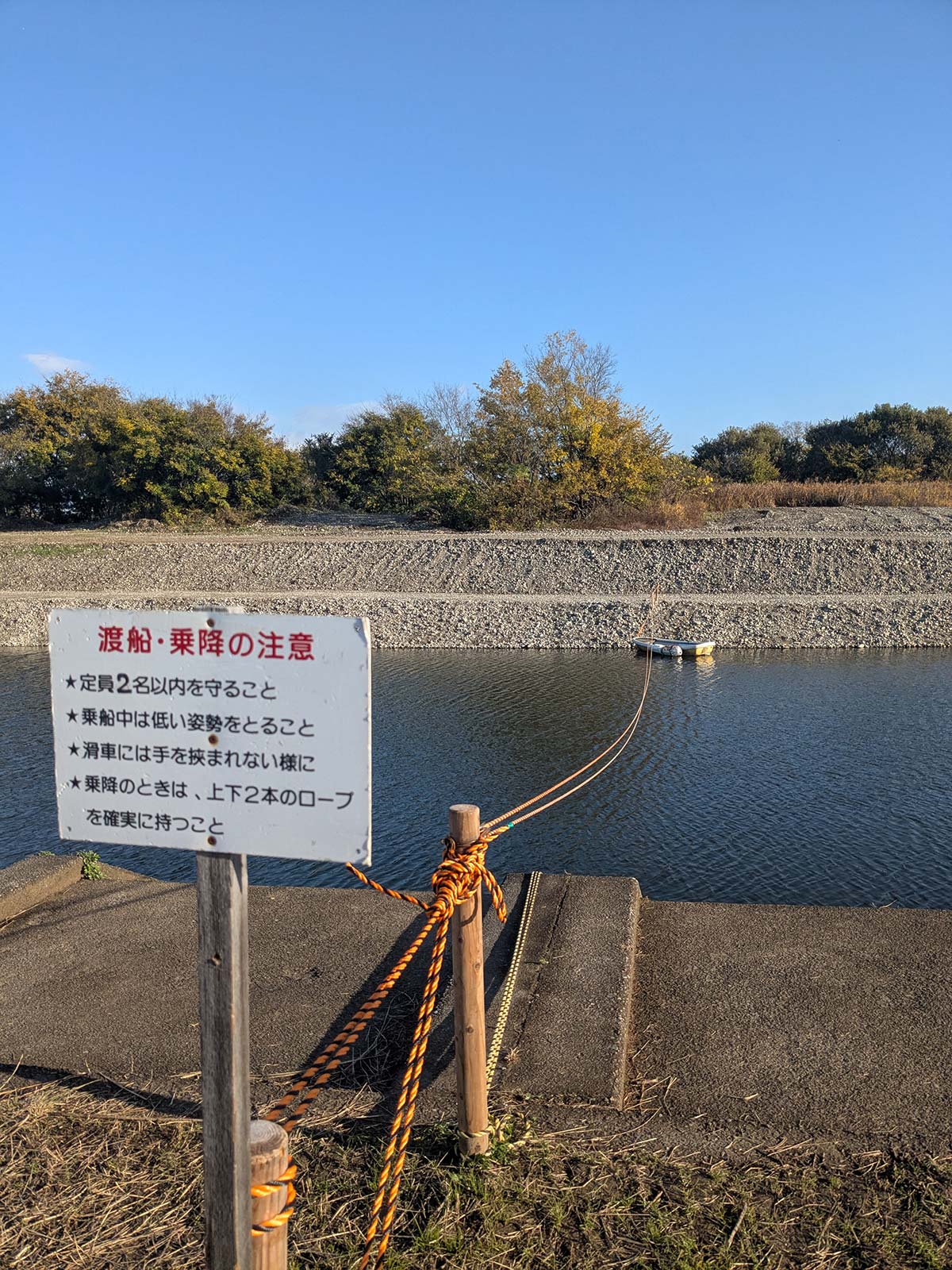 受付前に渡し舟があります。対岸までショートカットしたい方向けです。オールで漕ぐ方式でなく、滑車付きロープを手繰りながら前に移動します。移動時は指先や竿先がロープに巻き込まれないようにする注意が必要です。歩いて対岸に渡る場合は下流側から回る事も出来ます。
