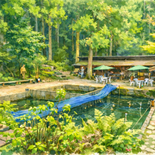 門岡養殖場は愛媛県にある管理釣り場。 鈍川温泉の上流部にあるあまご釣り堀。竿えさは現地で借りられるので手ぶらでOK。釣った魚は塩焼きなどで調理してもらう事も出来る。