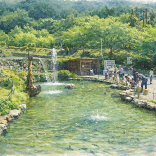 広島県北広島町『大暮養魚場』は自然豊かな大暮川沿いにある釣り堀。地元で育ったニジマスのえさ釣りやつかみどり体験もできます。広島県のブランドサーモン生産の中心地。