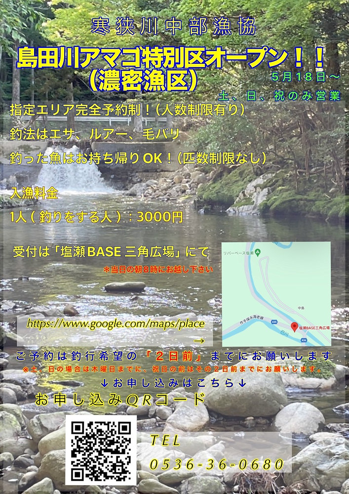 準備に時間がかかり、ご迷惑をおかけいたしましたが、5月18日(土)より島田川アマゴ特別漁区をオープンします。(営業日は、土、日、祝日のみです) 完全予約制で、1日の人数制限がございます(MAX10名まで)遊漁時間は団体エリアは9時~12時まで、シングルエリアは9時から15時までで...