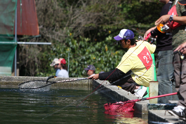 決勝は上池を山側(Aエリア)、川側(Cエリア)の2つのエリアを使って10時30頃から開始。決勝前放流が入ったため、最初は予選同様のお祭り状態となり、その後の時間帯はポツポツと釣れ続く展開になる。しかし後半になると予選使われなかったAエリア側からのキャストには魚の反応があるものの、Cエリア側からのキャストへの反応がやや息切れする場面も見られた。結局最後は地元勢同士の決勝サドンデスに突入し、トーナメント経験の差を見せた八塚利幸さんが通算3度目の優勝をホームで飾った。