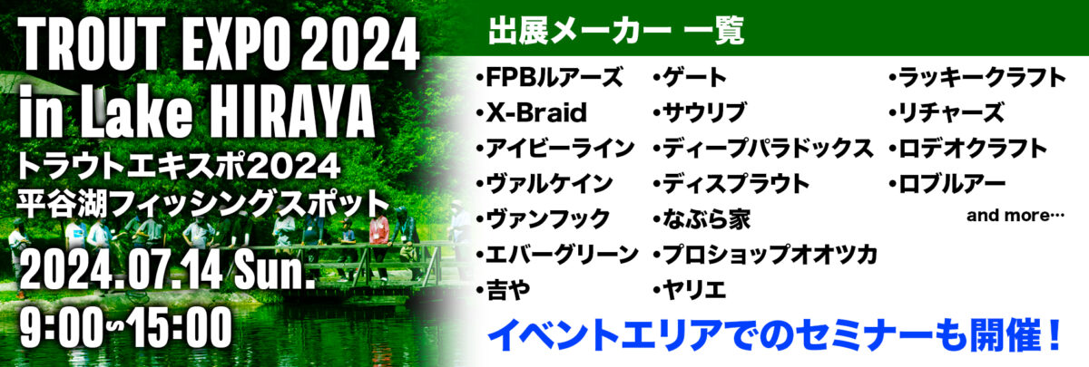 イベント情報TROUT EXPO 2024(トラウトエキスポ2024)が7/14日、平谷湖フィッシングスポットで開催される。国内人気メーカーが多数出展、実釣を通してトッププロからお話を聞ける貴重な機会です。