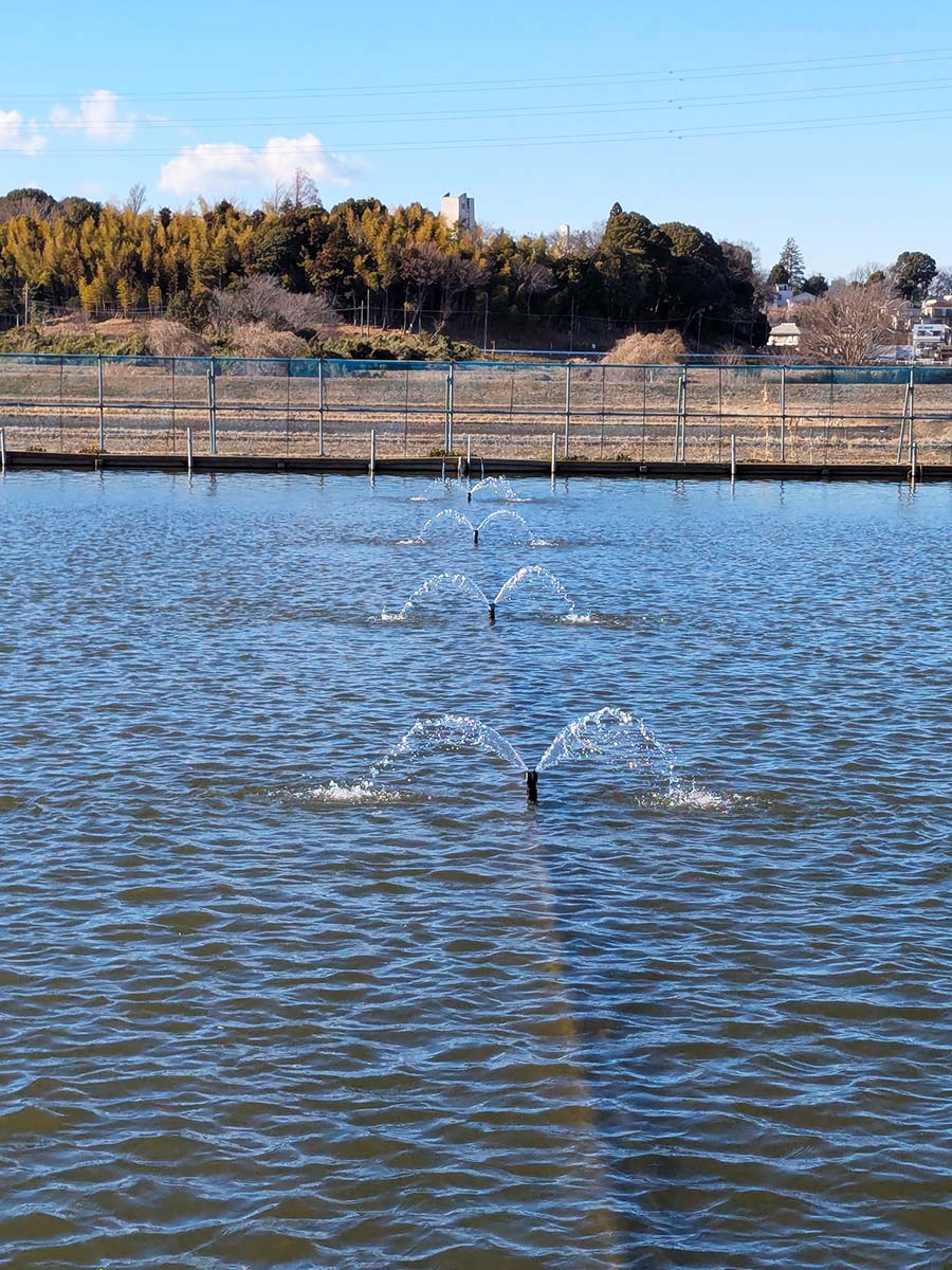 リリース池は横から見るとW字形状。中央の噴水付近は水深15cm程度と浅くつくられています。沖のブレイクと手前のブレイクには魚がつきやすい特徴があります。最大水深は1.3m程度